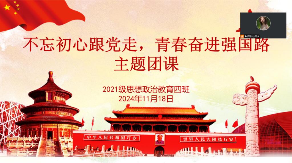 10月18日上午,金年会jinnianhuicom2021级思想政治教育四班在腾讯会议开展“不忘初心跟党走,青春奋进强国路”主题团课。2021级思想政治教育四班全体学生共同参加本次团课。团课由团支书刘珂含主持。