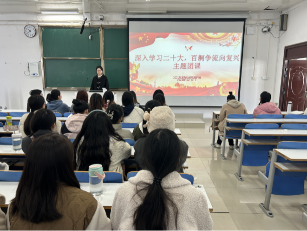 10月17日上午,金年会jinnianhuicom2021级思想政治教育四班在社科楼515教室开展“深入学习二十大,百舸争流向复兴”主题团课。2021级思想政治教育四班全体团员参加本次团课。团课由团支书刘珂含主持。